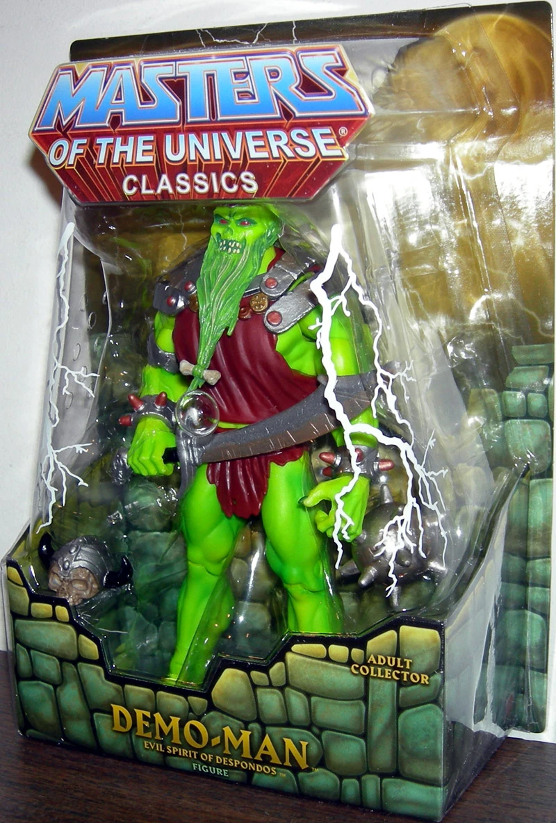 With this highly anticipated release, the origin of Skeletor is at last revealed! Based on concept art for Skeletor from 1980, 6″ tall Demo-Man is now re-envisioned as the evil spirit who melded with Keldor to form Skeletor, the ultimate Overlord of Evil. This highly-detailed, fully articulated figure was designed by the Four Horsemen and comes complete with mace and sword weaponry, a skull trophy that can attach as a second head, and an alternate comic book-style Skeletor head for use on Skeletor figures.